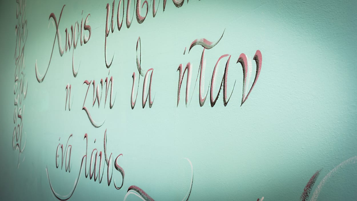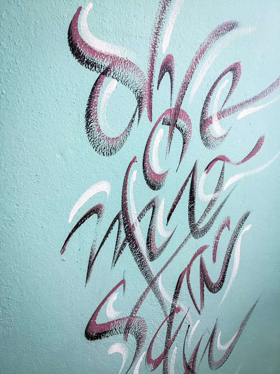 Για τη γραφή του ρητού χρησιμοποιήθηκε πινέλο και χρώματα που ταιριάζουν με τον τοίχο, όπως το σκούρο ροζ (που είναι στους δίπλα τοίχους), το μαύρο για να δώσει έμφαση και να τονίσει τα γράμματα και το λευκό για να δώσει ένα contrast.